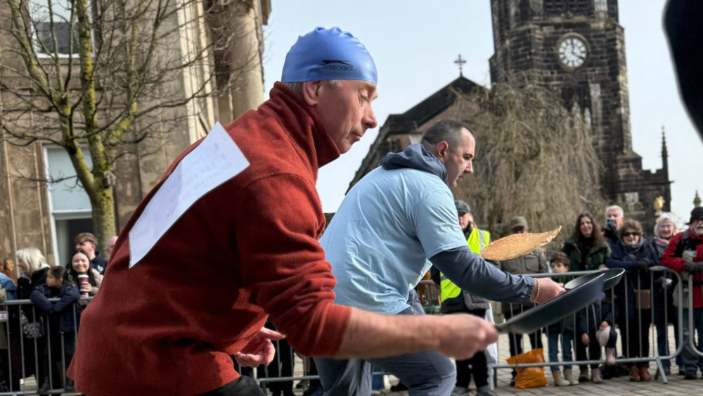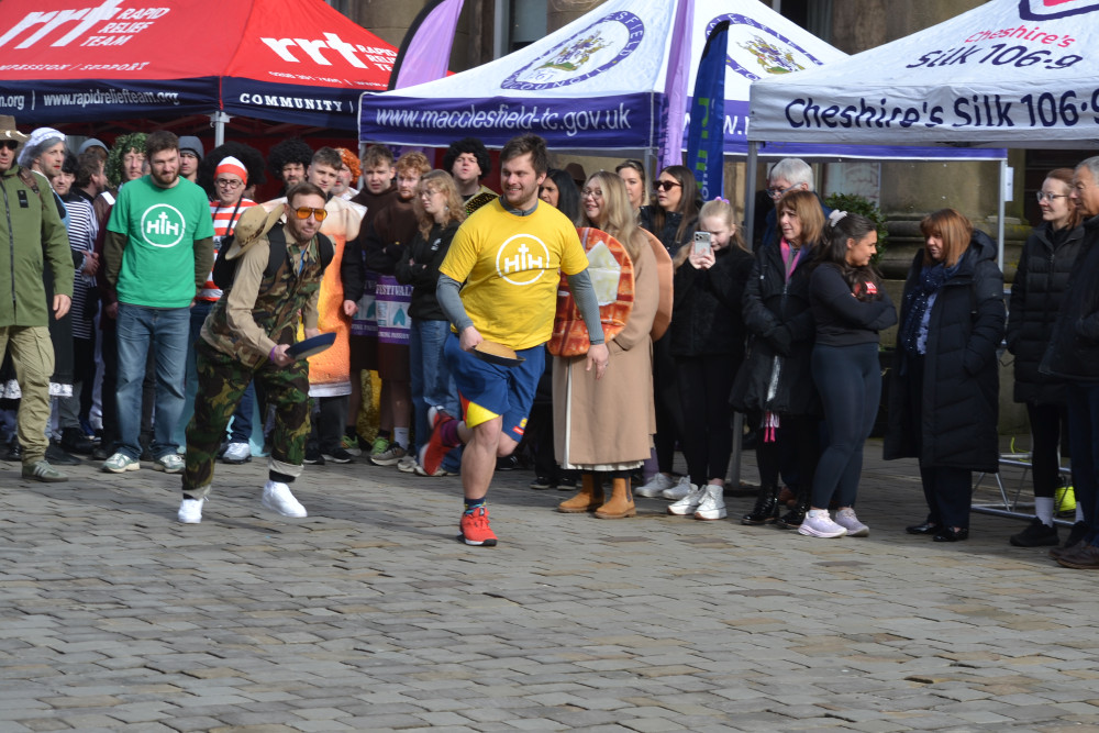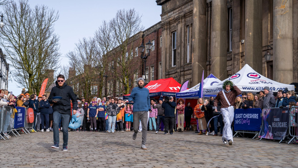 Two dozen teams took on the challenge of flipping a pancake up and down a short course between the Town Hall and Mill Street, raising over £1,300 for East Cheshire NHS Charity.