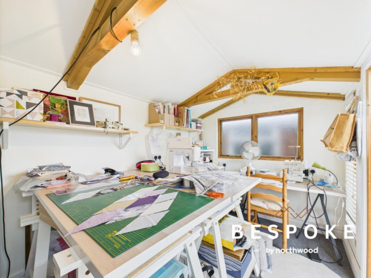A detached hobby room sits just beyond, fully insulated with French doors and garden views, ideal as a home office, studio, or creative space.